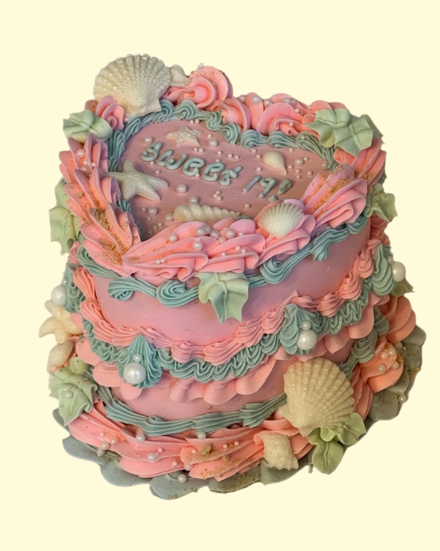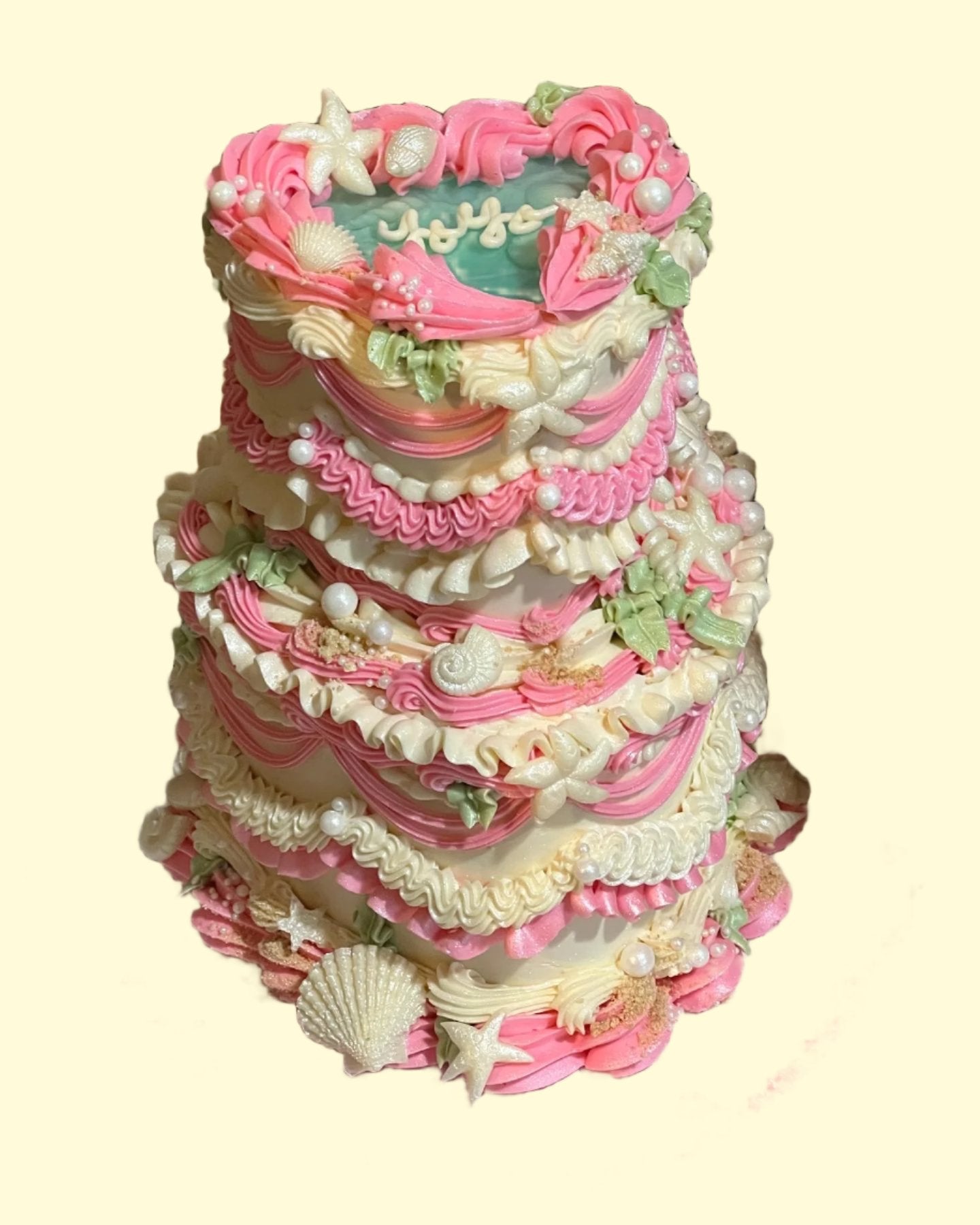 Includes white chocolate sea-shells, graham cracker sand, white pearl sprinkles, hand-piped buttercream kelp, finished with an edible pearl spray.